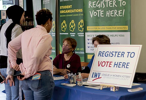 WCC students Tatyana Bradley and Mariam Hallok talk with volunteers from the League of Women’s Voters of Washtenaw County. | Ruby Go, Washtenaw Voice