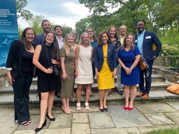 Governor Gretchen Whitmer stands in the front row, wearing a yellow dress. Michigan League of Conservation Voters support Whitmer’s campaign due to her environmentally-friendly policies. Courtesy of Nick Dodge