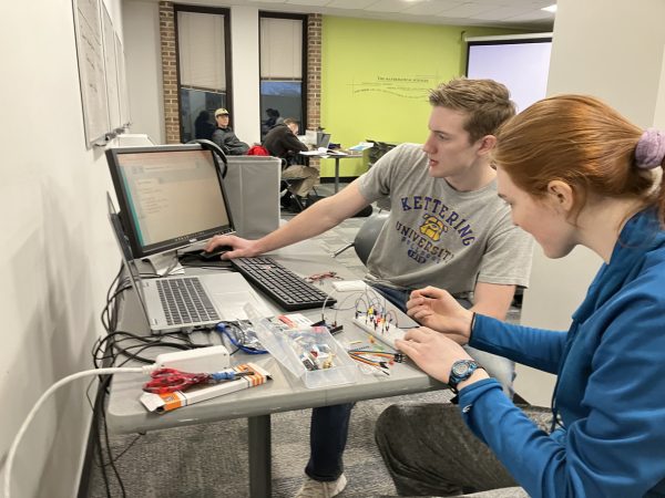 Mark Nitkiewicz, President of the Engineering Club, works with member Emma Pearson in LA225. Courtesy of Mark Nitkiewicz