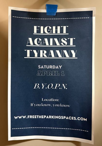 Fyuhrie-Rhode isn’t the only one speaking out against this new rule. At least 17 posters appeared around campus this March, claiming an uprising “against tyranny” will start April 1. Other details include a website that leads to a 404 page, the location (“If you know, you know,” the flier reads), and “B.Y.O.P.N.”