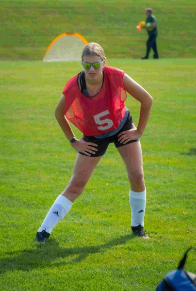 Annie Gapp stretches and gets ready for warm ups during soccer tryouts. Courtney Prielipp | Washtenaw Voice