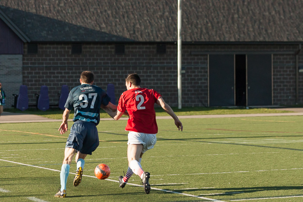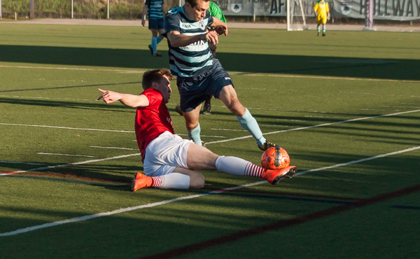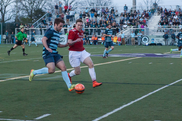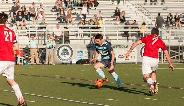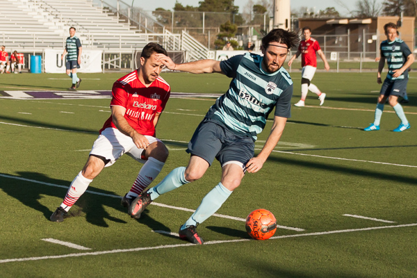 Ann Arbor midfielder Alex Morrisset keeps possession away from a San Marino player at the AFC Ann Arbor season opener on Friday, May 1 at Hollway Field. EJ Stout | Washtenaw Voice