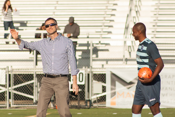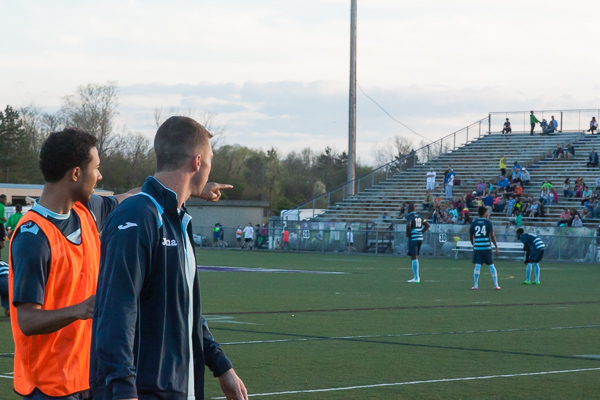 - Ann Arbor midfielder Vic Ammons talks with a teammate during the AFC Ann Arbor season opener on Friday, May 1 at Hollway Field. EJ Stout | Washtenaw Voice