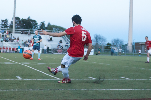 - San Marino midfielder Mike Pugh delivers a long ball at the AFC Ann Arbor season opener on Friday, May 1 at Hollway Field. EJ Stout | Washtenaw Voice