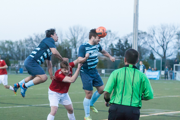 - Ann Arbor midfielders Kevin Robinson, left and Kyle Breitmeyer battles for a ball in the air at the AFC Ann Arbor season opener on Friday, May 1 at Hollway Field. EJ Stout | Washtenaw Voice