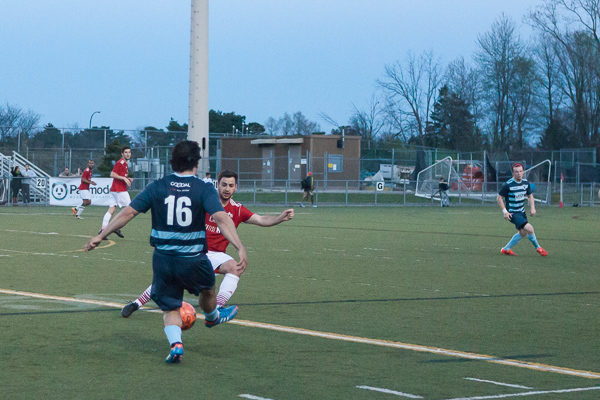 - San Marino midfielder Mike Pugh delivers a long ball at the AFC Ann Arbor season opener on Friday, May 1 at Hollway Field. EJ Stout | Washtenaw Voice