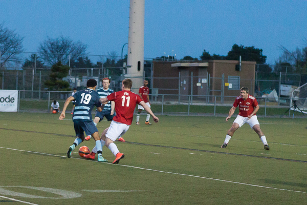 Ann Arbor midfielder Alex Morrisset keeps possession away from a San Marino player at the AFC Ann Arbor season opener on Friday, May 1 at Hollway Field. EJ Stout | Washtenaw Voice