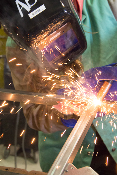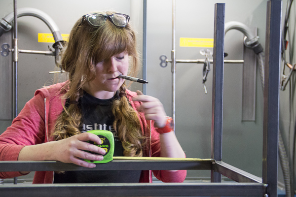 A.D. Quinn, a 29-year-old custom cars and concepts student from Ypsilanti, cuts steel to length for a chair she is fabricating for an upcoming charity auction. Gray Bancroft | Washtenaw Voice