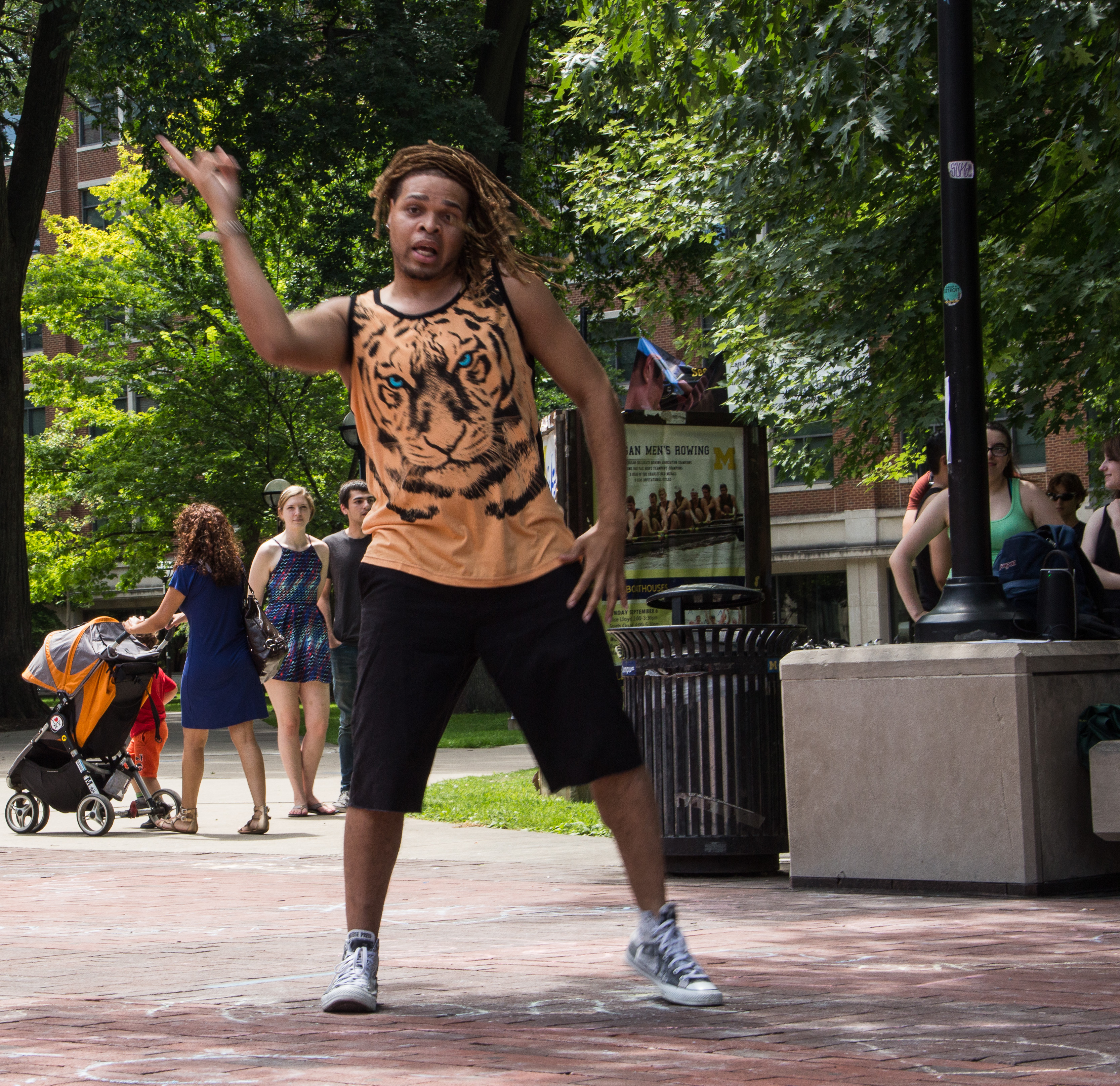 Trevon Callahan, a 22-year-old dance student from Ypsilanti, performs his solo act during the performing arts showcase at the Ann Arbor Art Fair. GRAY BANCROFT | WASHTENAW VOICE