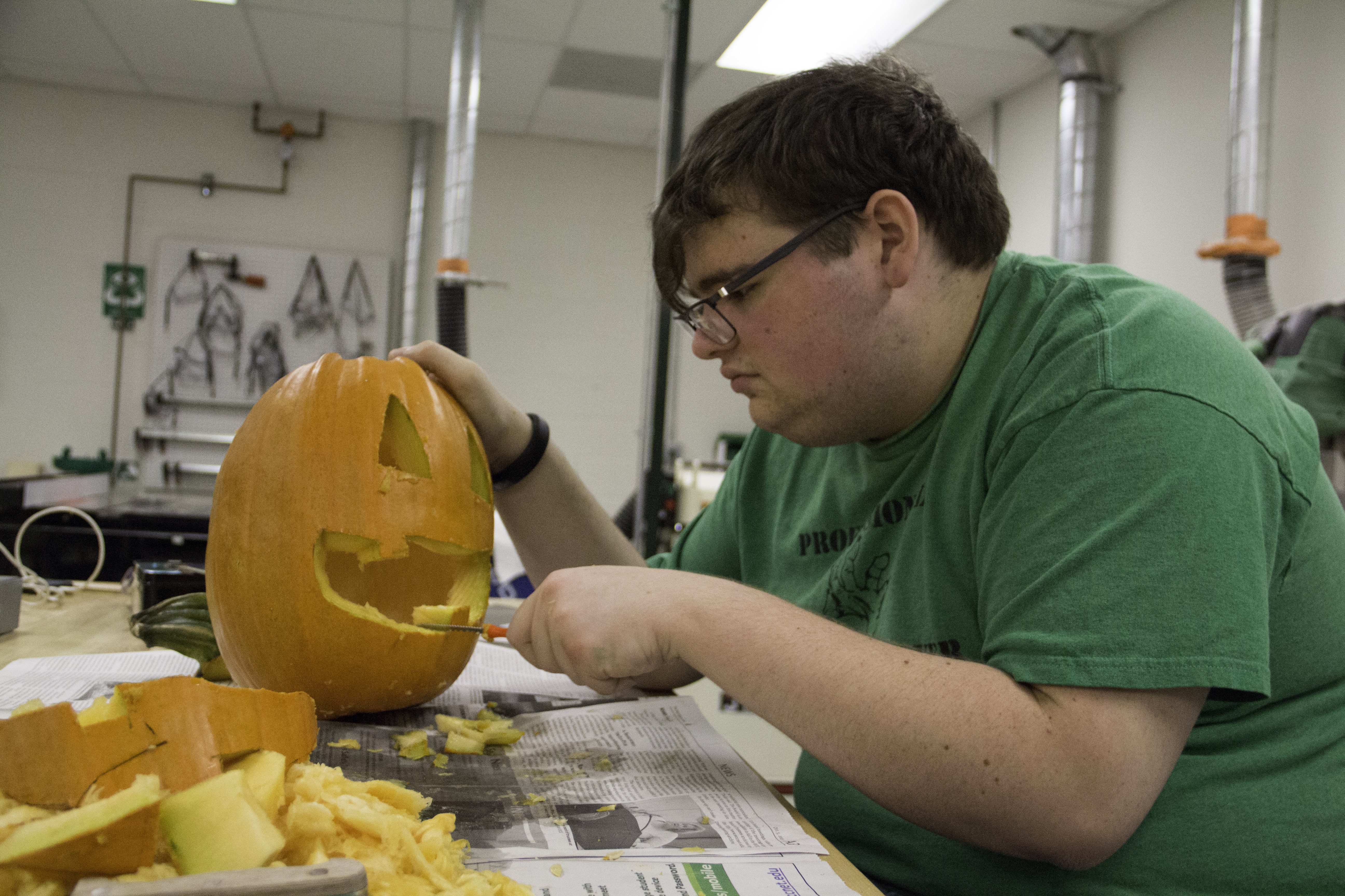 Cameron Tripp, a 19-year-old 3-D animation student from Brighton works with his class to carve pumpkins for the Ypsilanti Senior Citizens Center. Gray Bancroft | Washtenaw Voice