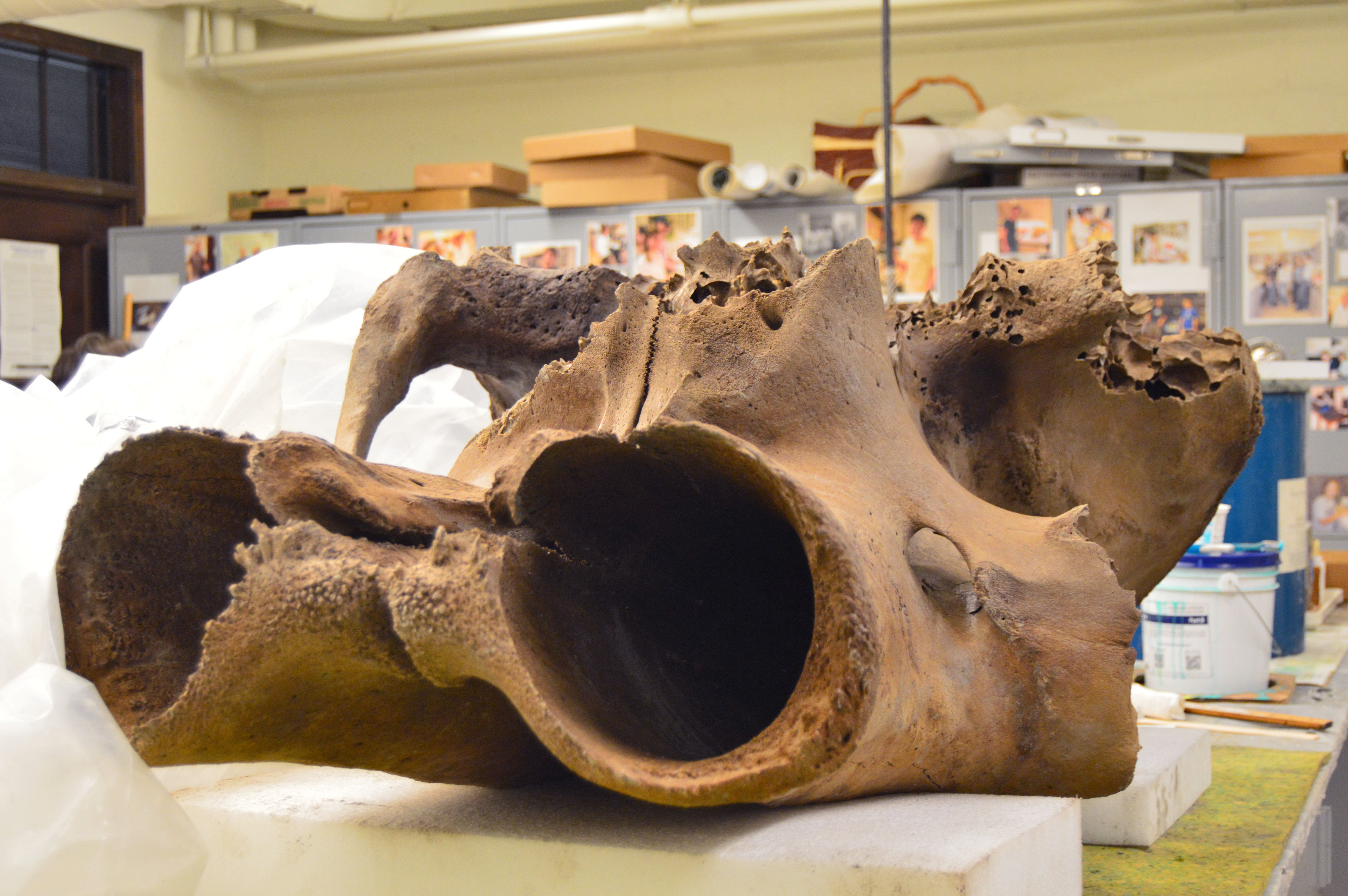 “When things come out of wet sediment like (fossils), they are retaining a lot of moisture. To avoid getting fractures in the bone, they have to be dried slowly.” Rountrey says, “So this bone still has a collagen matrix, the organic matrix, and that will cause it to shrink a little bit as it dries.” It is preferable that it happens uniformly so there ends up being no fractures in the bone itself.