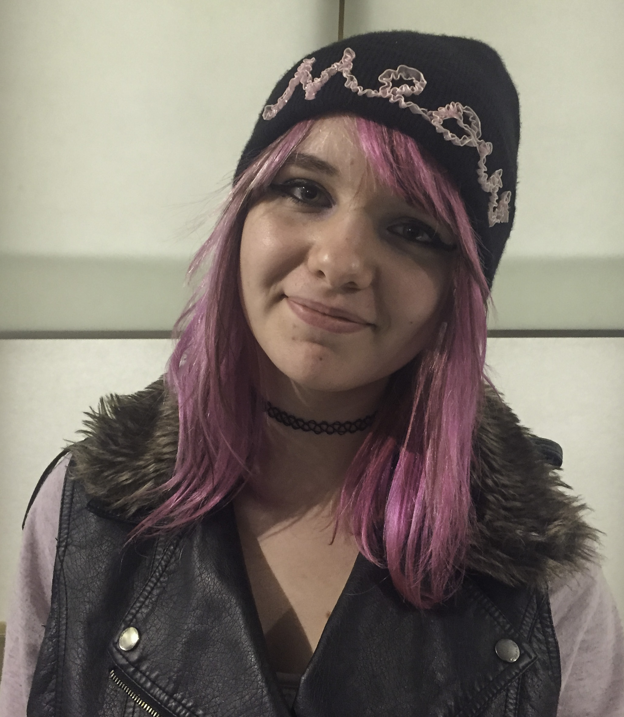“My job, I work in retail, and they don’t really have a policy on dress code, so I’ve been able to dye my hair whatever I want and I do. Last winter I had it half pink and half purple, and people were kind of weird about it at my work, but since they didn’t have a dress code about it, no one really said anything to me. So I continued doing whatever I wanted, I guess.”