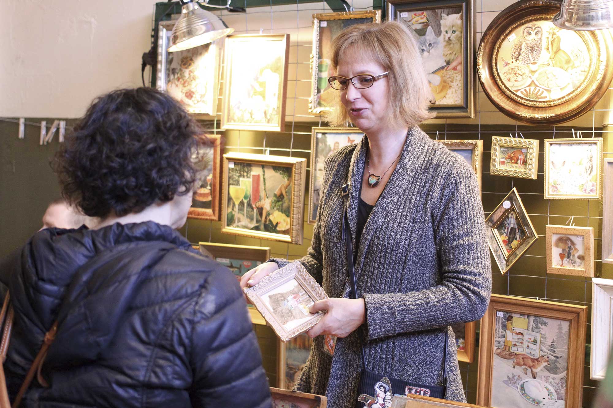 - Teresa Petersen displays some of her artwork, much of which focuses on a theme of women’s roles in society throughout history. Find her at teresapetersen.com. Vardan Sargsyan | Washtenaw Voice