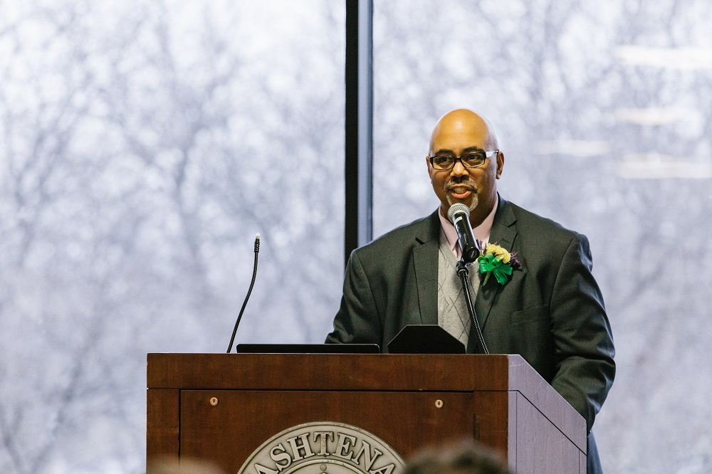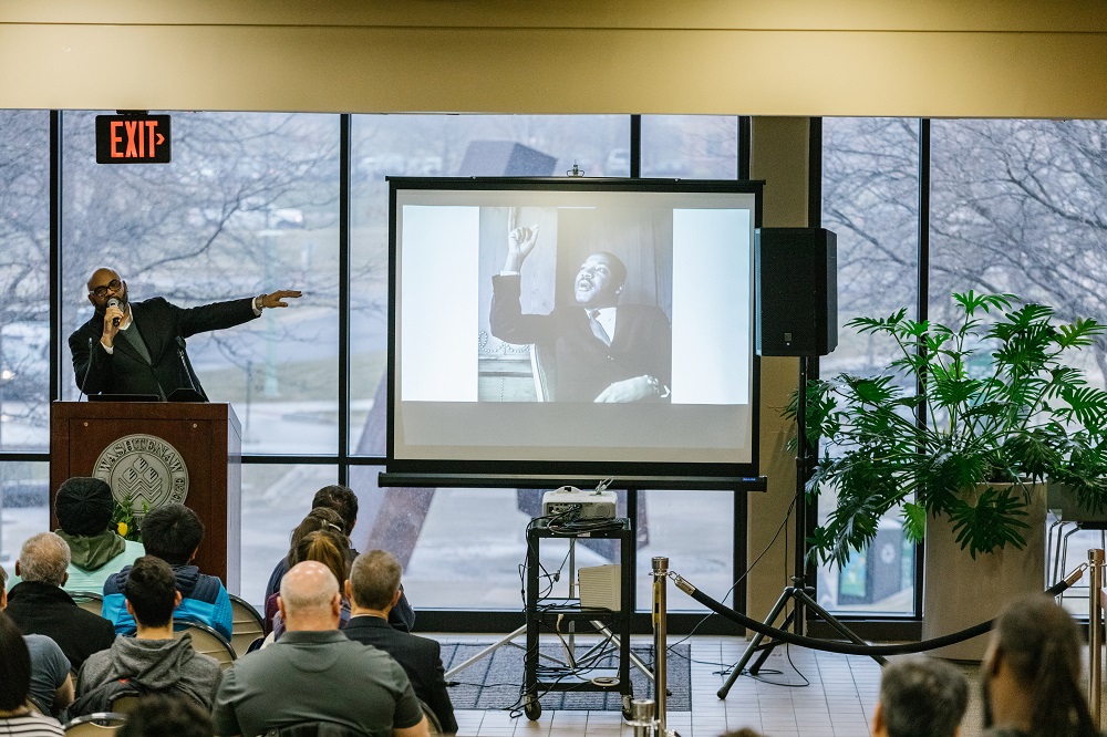 - Clarence Jennings Jr., dean of student access, success, equity and inclusion, began the King Day celebration with opening remarks. Sara Faraj | Washtenaw Community College
