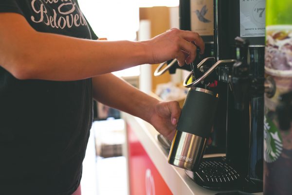 The Spot offers $1 coffee refills when patrons bring in a reusable coffee mug or cup. There is also another coffee machine on the parking garage side of the LA building, located on the first floor just under the bridge. This particular machine is convenient because it is easy to access from the parking garage and Clark Road parking lot. This machine provides surprisingly good coffee for the affordable price of $1 and has everything ranging from lattes to regular coffee to mochas.