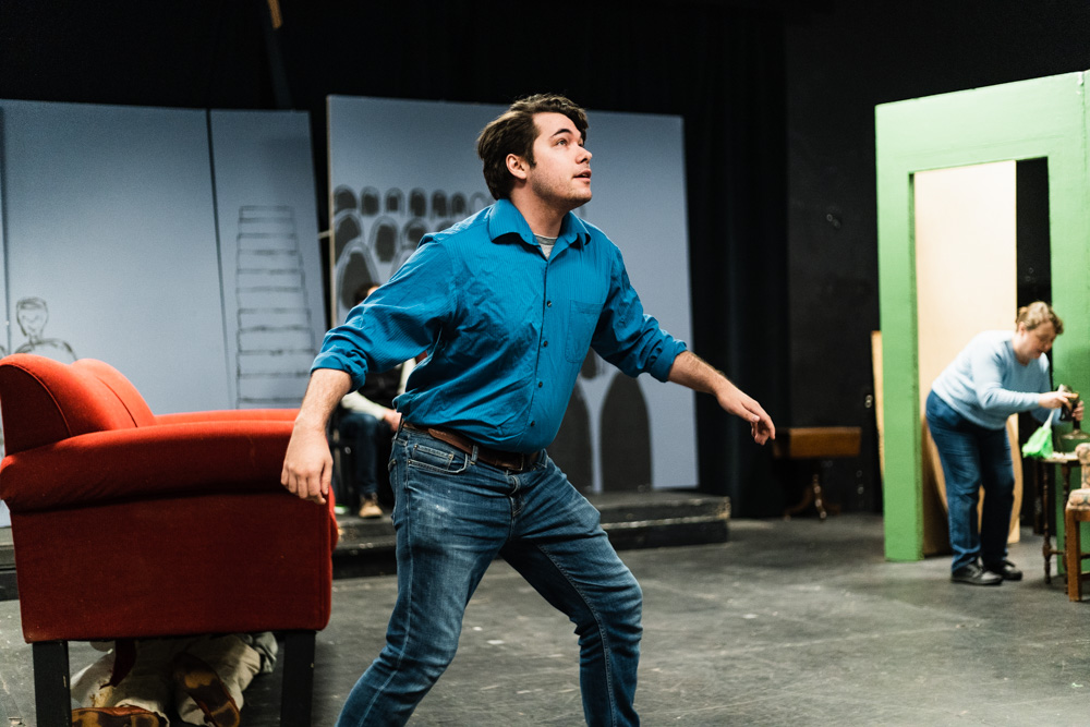 David Crews, a WCC theater student, and Haley Cook rehearsing their roles in “The Real Inspector Hound”. Torrence Williams | Washtenaw Voice