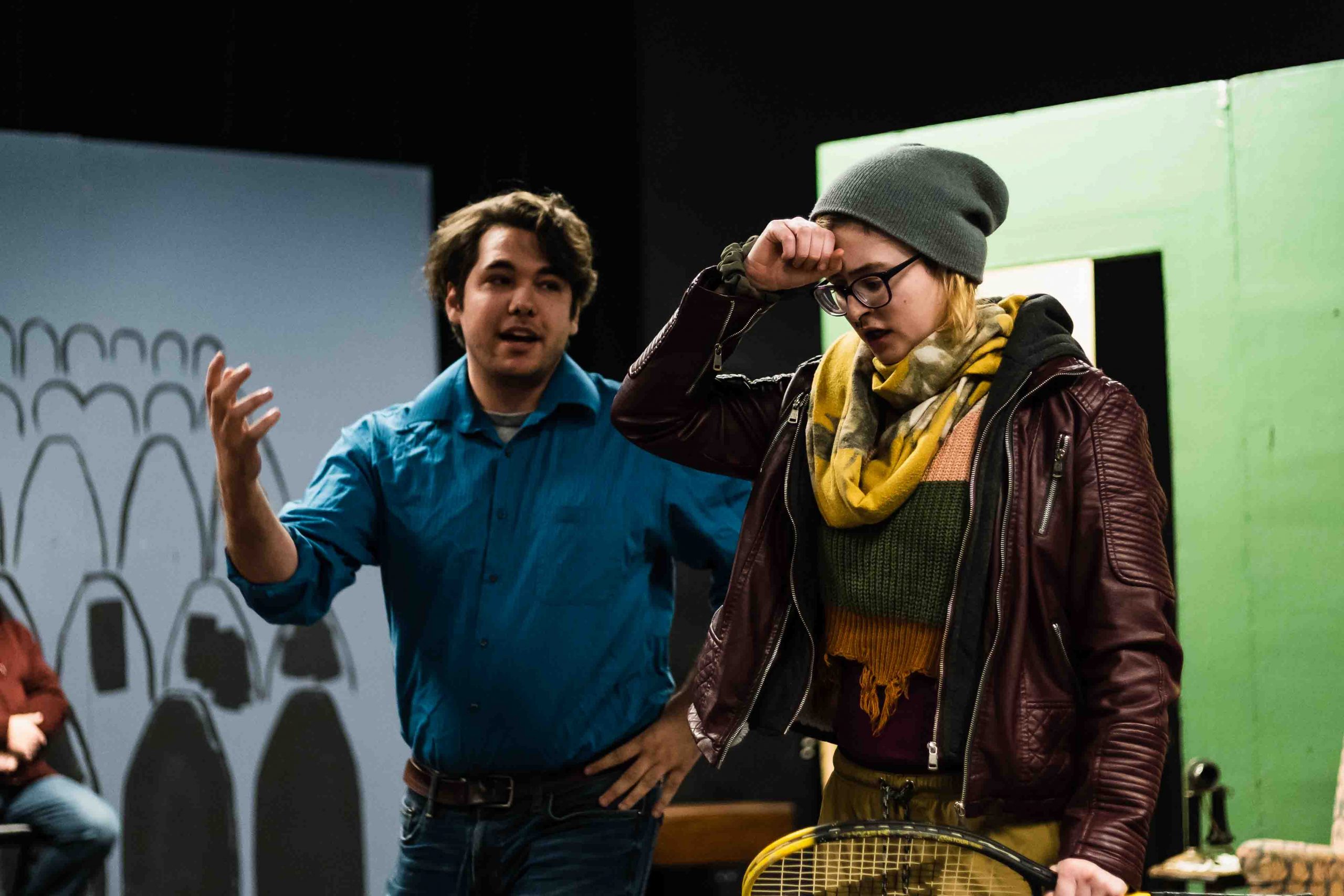 David Crews, a WCC theater student, and Haley Cook rehearsing their roles in “The Real Inspector Hound”. Torrence Williams | Washtenaw Voice