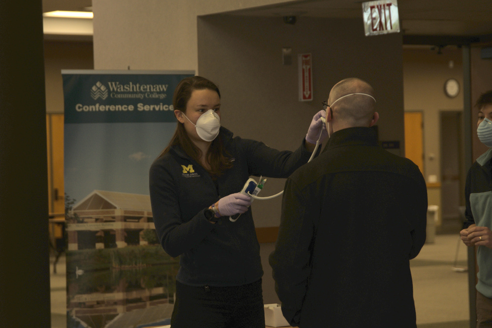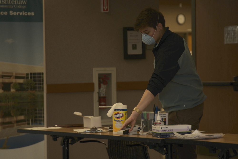 - A volunteer setting up a temperature taking station. Torrence Williams | Washtenaw Voice