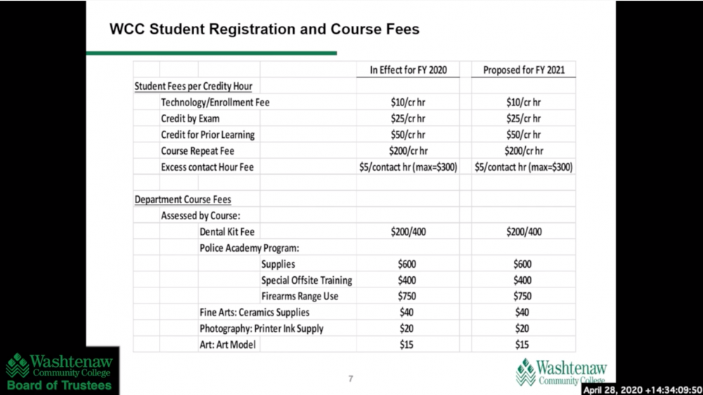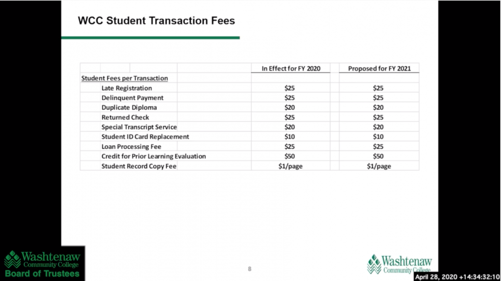 - Screenshot of materials presented at the board of trustees’ virtual meeting on April 28. Trustees voted to approve a 0% increase in tuition rates and fees for the 2020-21 school year. Lilly Kujawski | The Washtenaw Voice