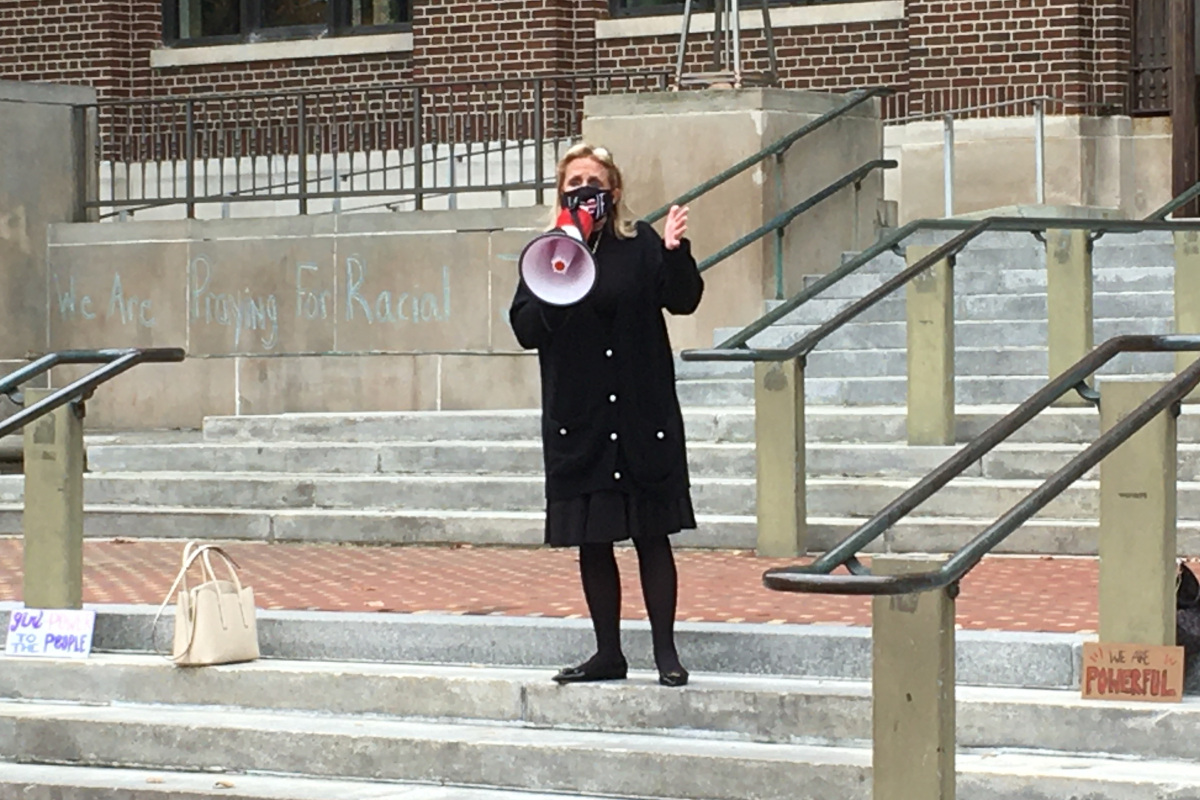 - U.S. Rep. Debbie Dingell speaking on the steps of the University of Michigan Library.