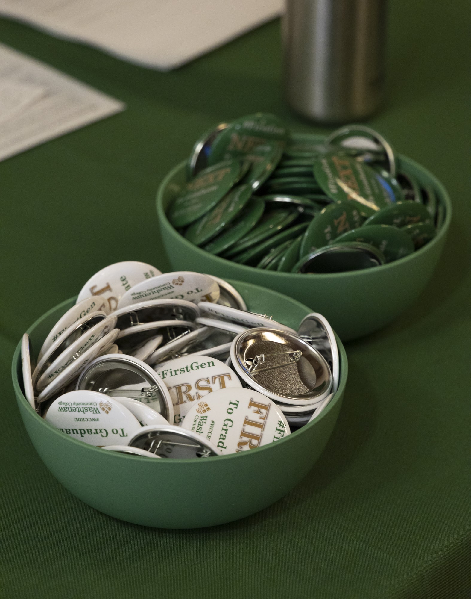 White buttons with the words “FIRST to graduate” were given to first-gen students, and dark green buttons that read “NEXT to graduate” were given to continuing-gen students. Shelby Beaty | Washtenaw Voice