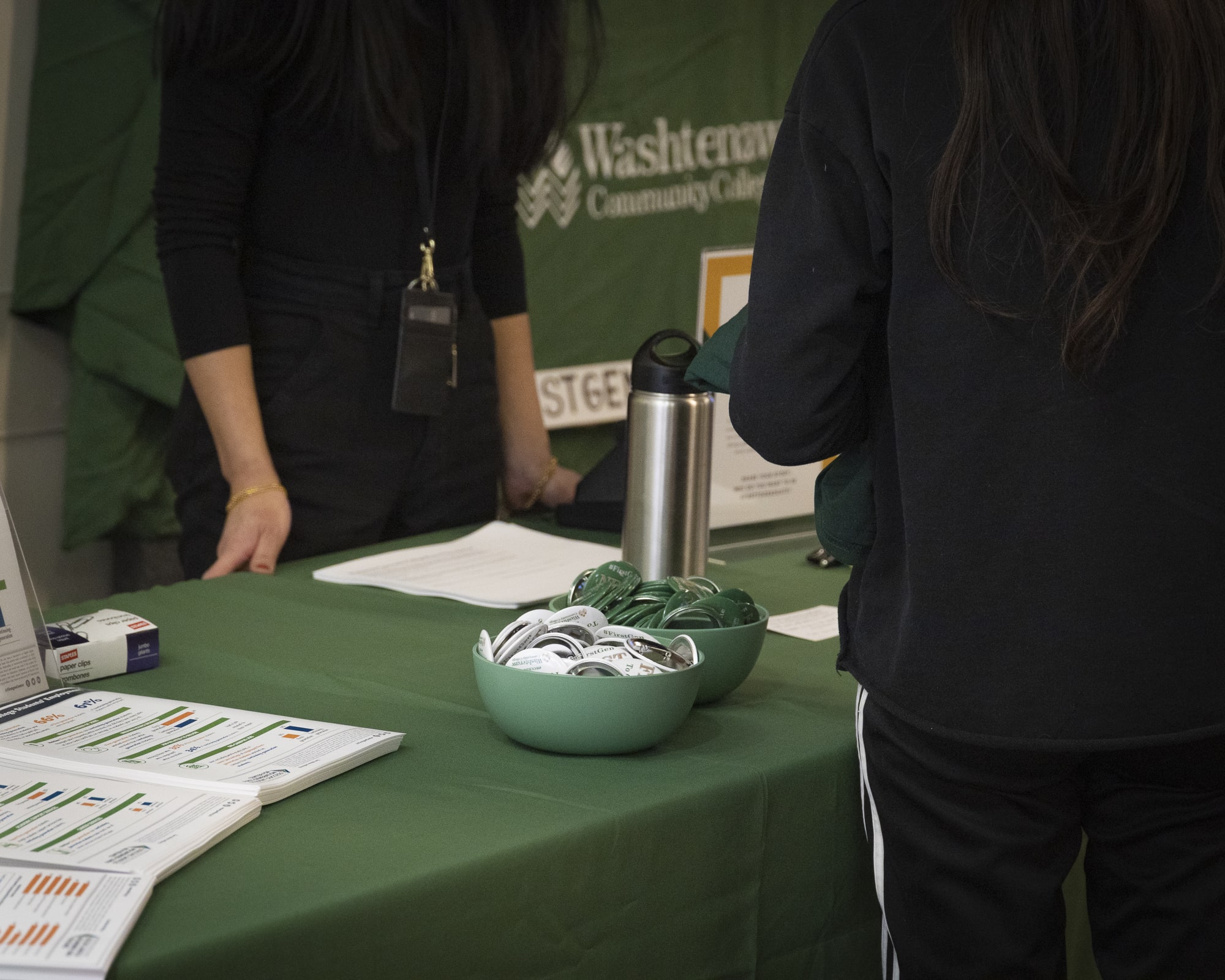 Buttons and informational handouts about first-gen students were set up on a table. Shelby Beaty | Washtenaw Voice