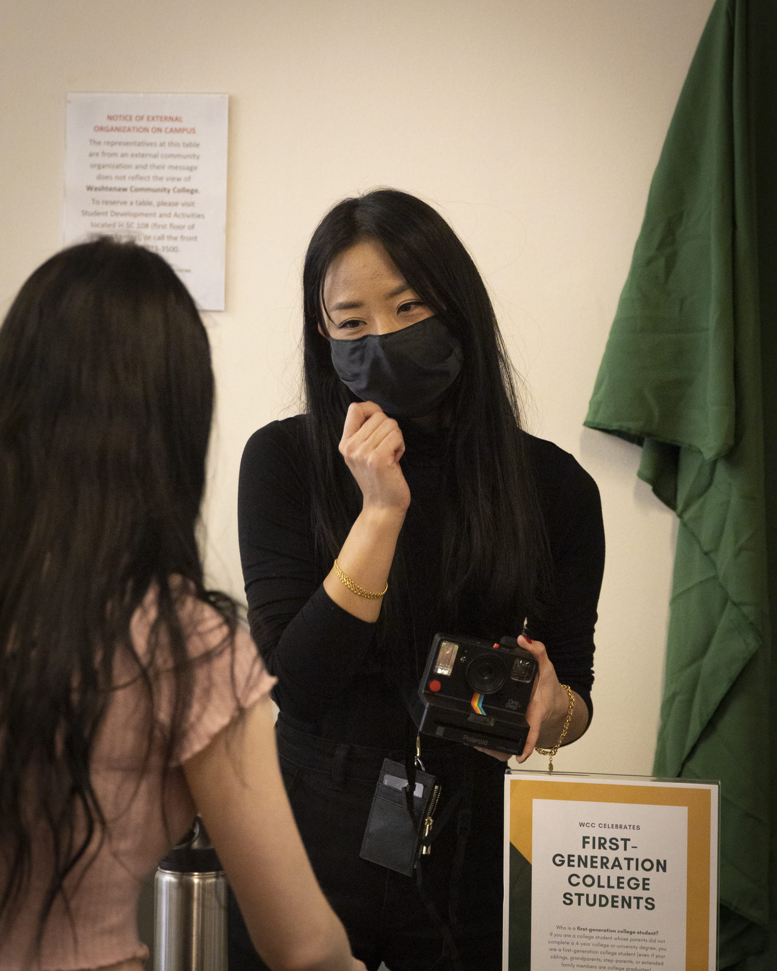 Christina Do, coordinator of Student Equity and Inclusion, uses a Polaroid camera to take pictures of first-gen students. Shelby Beaty | Washtenaw Voice