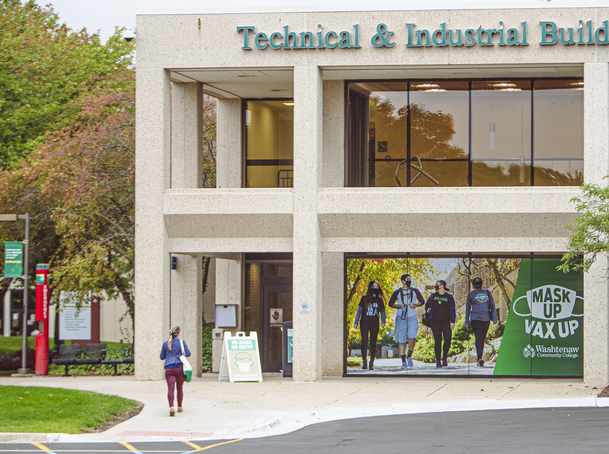“Mask up – vax up” window poster, featuring masked students on campus, in front of the WCC Technical and Industrial building, Sept. 13. Shelby Beaty | Washtenaw Voice