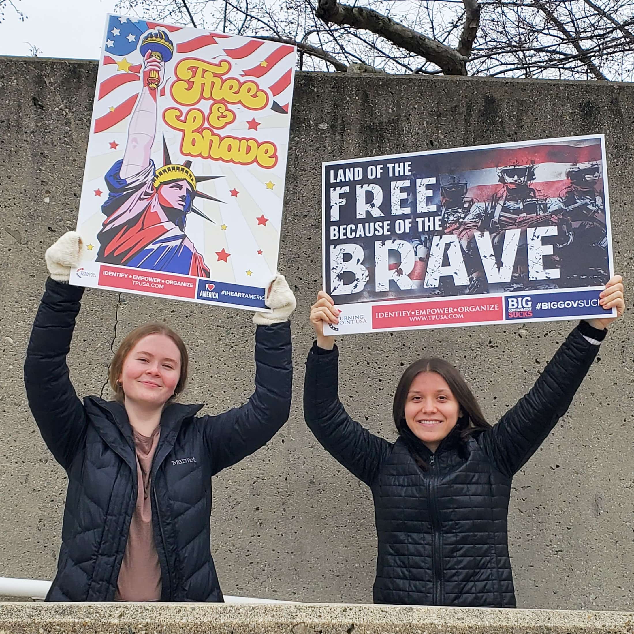 WCC Turning Point USA officers Sophia Tomlinson, left, and Sandy Blindu, right, hold signs displaying the youth organizations slogans. Courtesy of Sandy Blindu