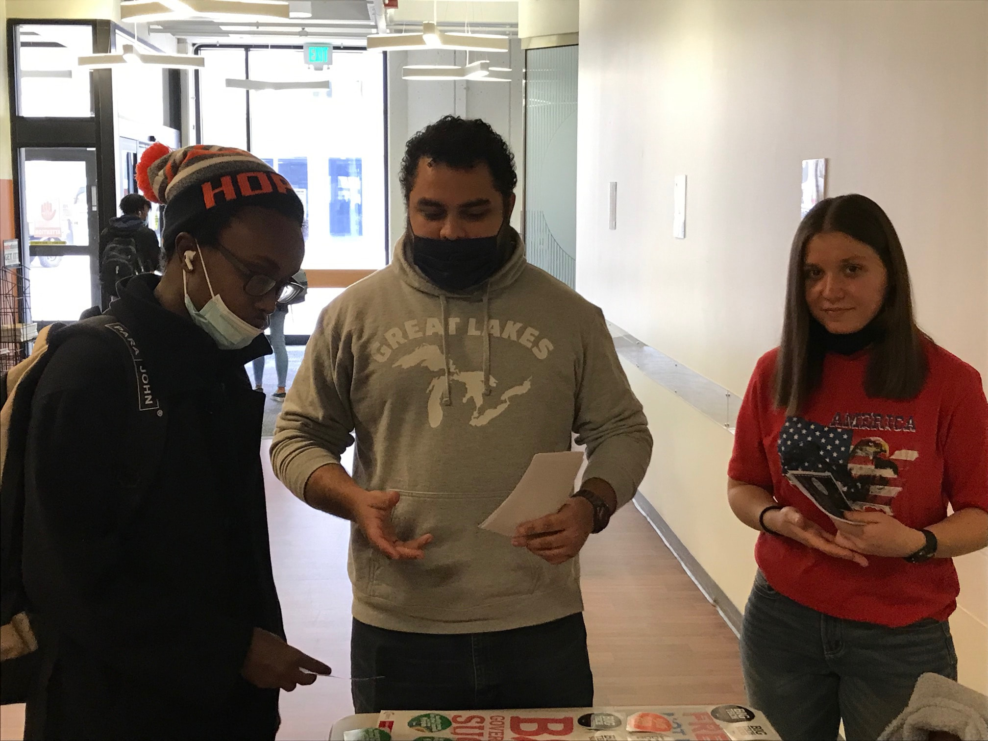 Sophia Tomlinson, left, David Blindu, center, and Sandy Blindu work the TPUSA table every Wednesday in the student center. The group offers buttons, stickers, and posters for students. Jordan Scenna | Washtenaw Voice