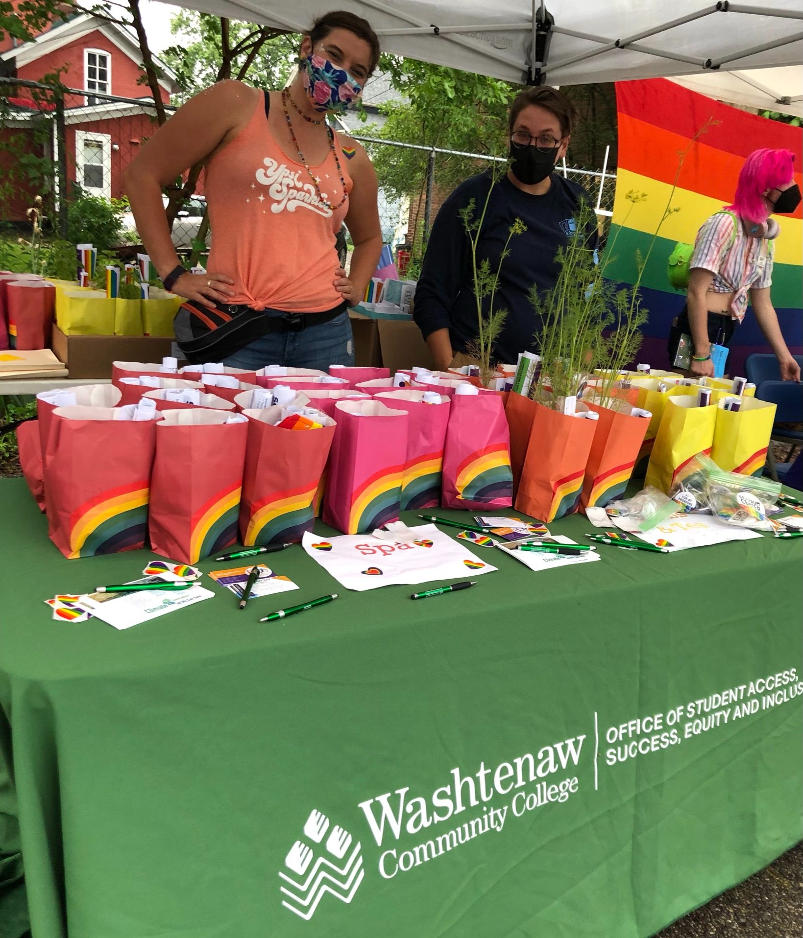 The Outspace+ gift bag booth at Ypsi Pride on June 25, 2021. From left to right: Katie Williams and Emily Finkenbine. Taken by Mary Mullalond