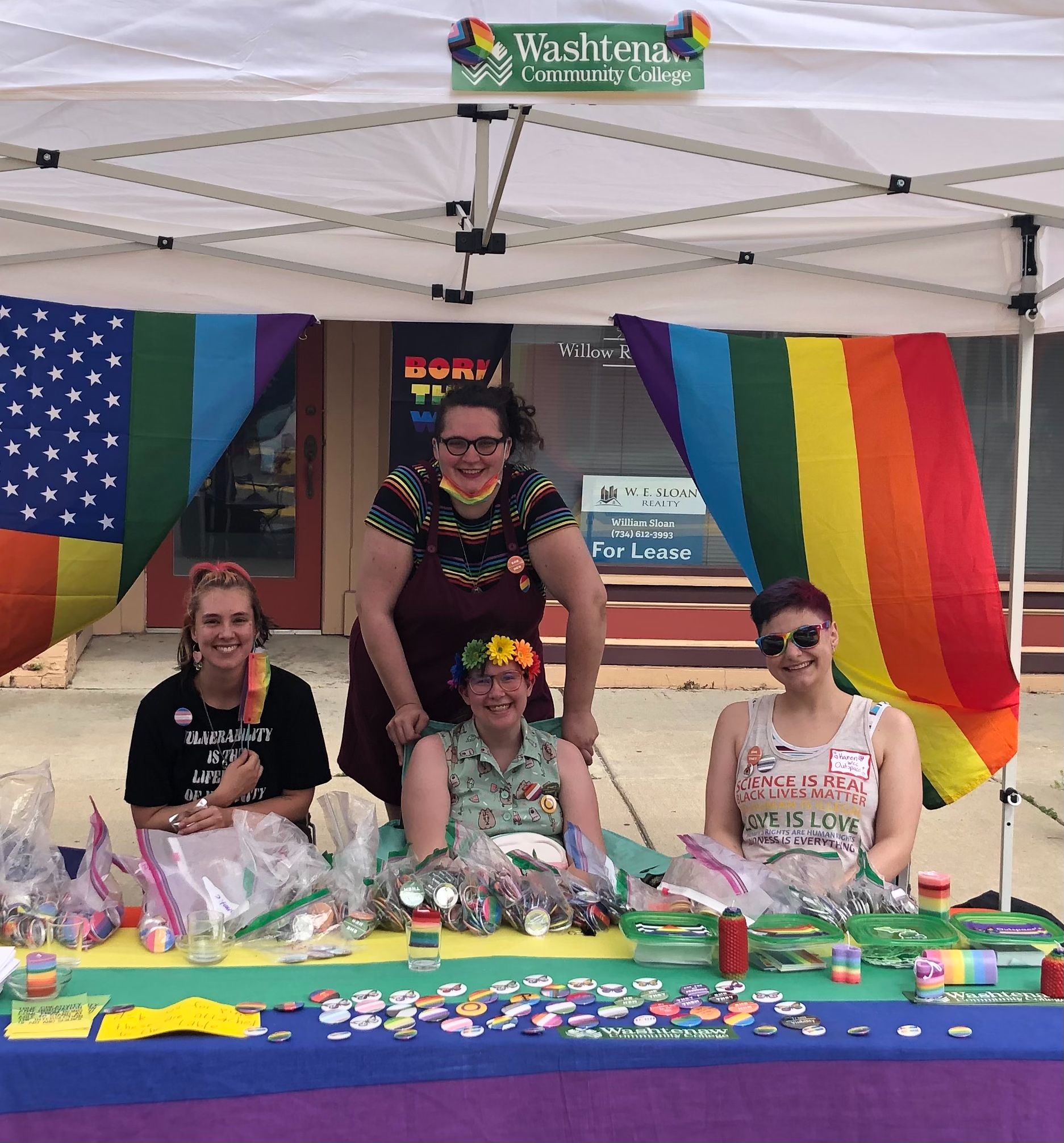 WCC’s Outspace+ booth at Ypsi Pride on June 25, 2021. Pictured from left to right: Ira Smith, Emily Waters, Latitude Brown, and Karen Lewis. Taken by Mary Mullalond