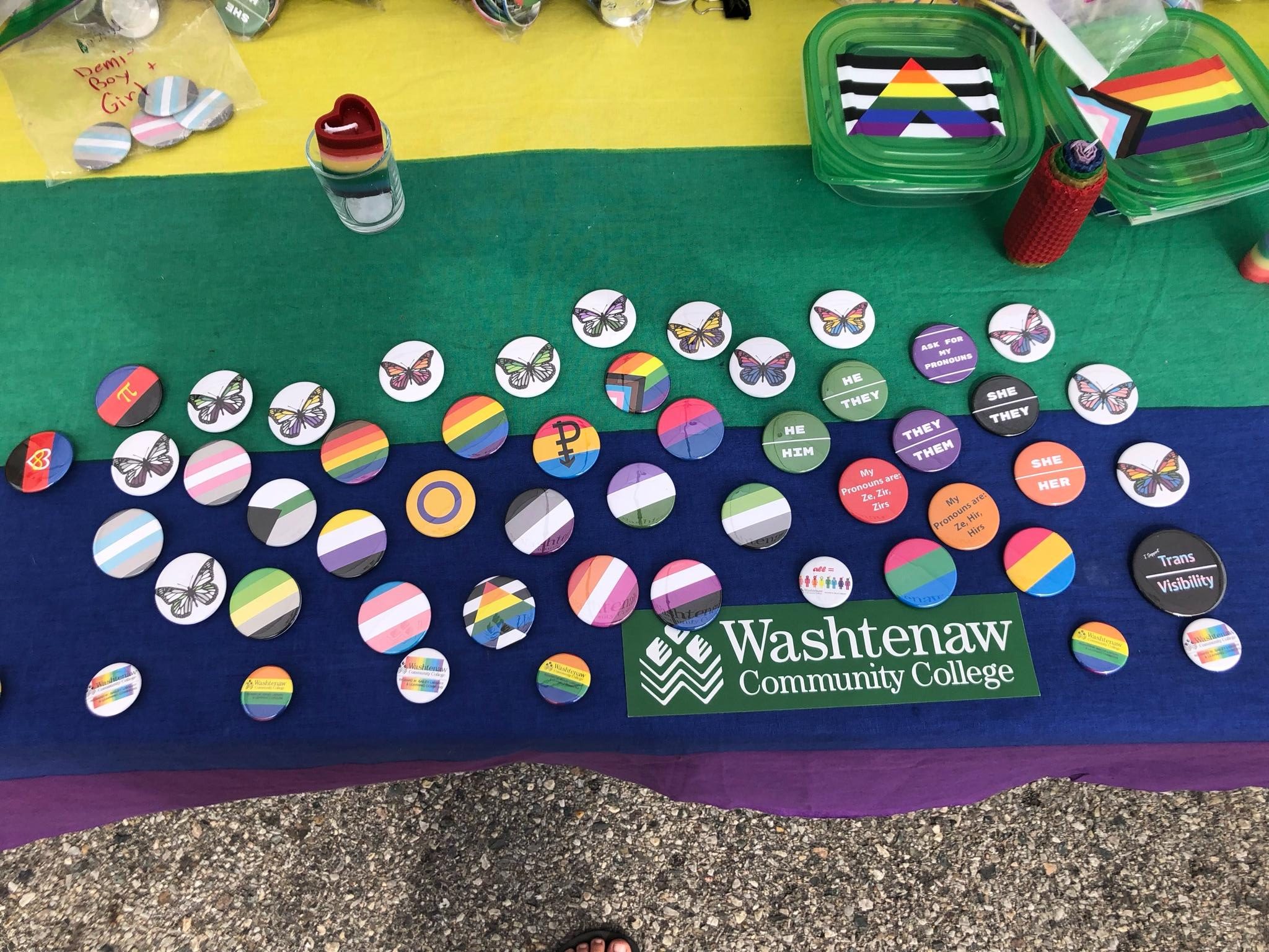“Last year, Outspace+ [WCC’s LGBTQ+ club] helped out with two different YpsiPride events. I loved getting together with a bunch of our club students to make buttons to give away at pride! So many vendors at pride charged for buttons, so […] the faces of people lit up when they realized they could choose any identity or pride buttons they wanted for free, from the WCC booth!” ~Mary Mullalond, she/her, English faculty/Outspace+ advisor