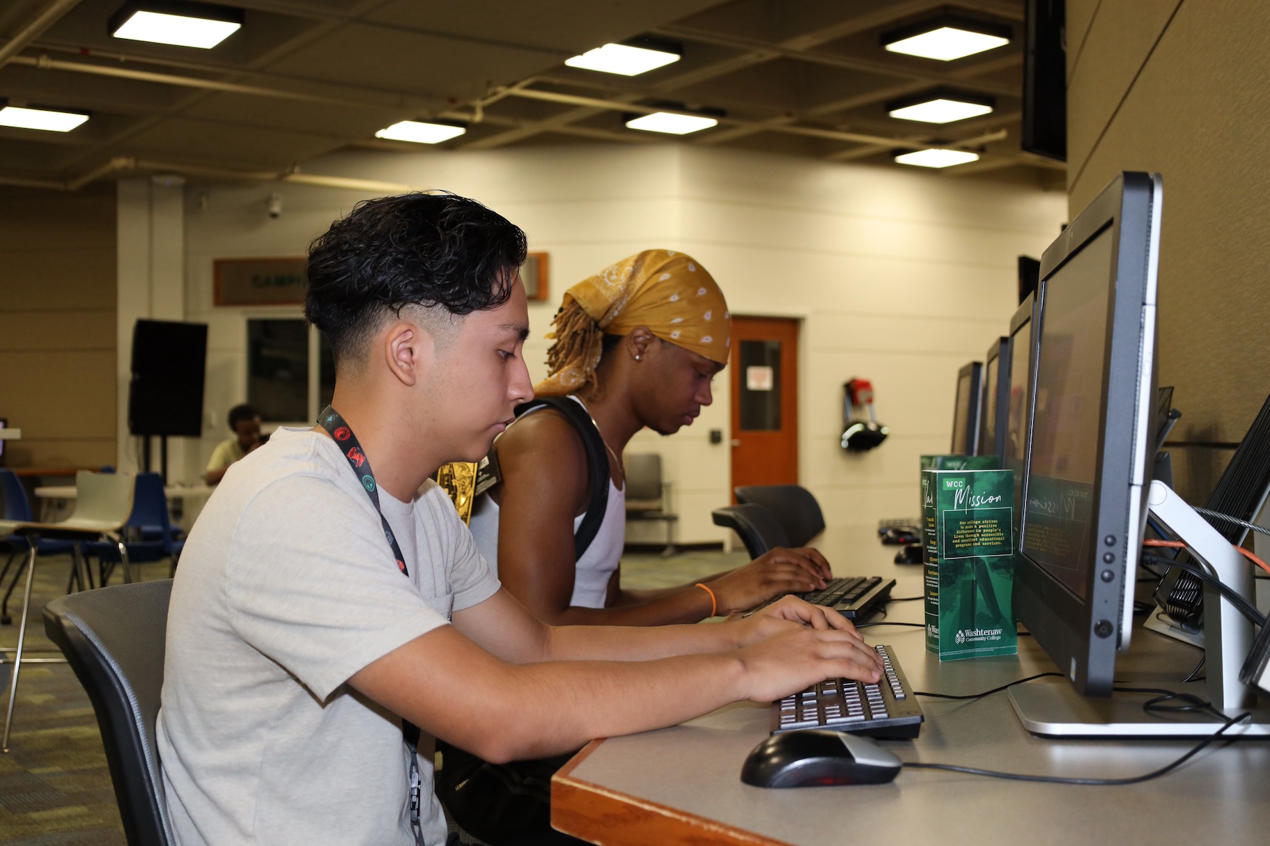 From left: Jesus Cariaga-Zamorano and Caleb Mason registering for their fall 2022 classes. Paula Farmer | Washtenaw Voice.