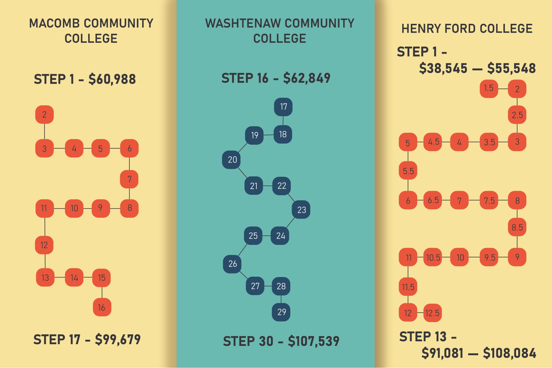 WCC’s pay schedule begins at step 16. Henry Ford breaks up salaries into education levels (less than master’s,master’s, doctorate, etc.) for each step with the top end requiring a doctorate. WCC and Macomb use multiple factors, including awarded degrees, earned credit listed on transcripts, experience, certificates, and licenses to determine step placement.