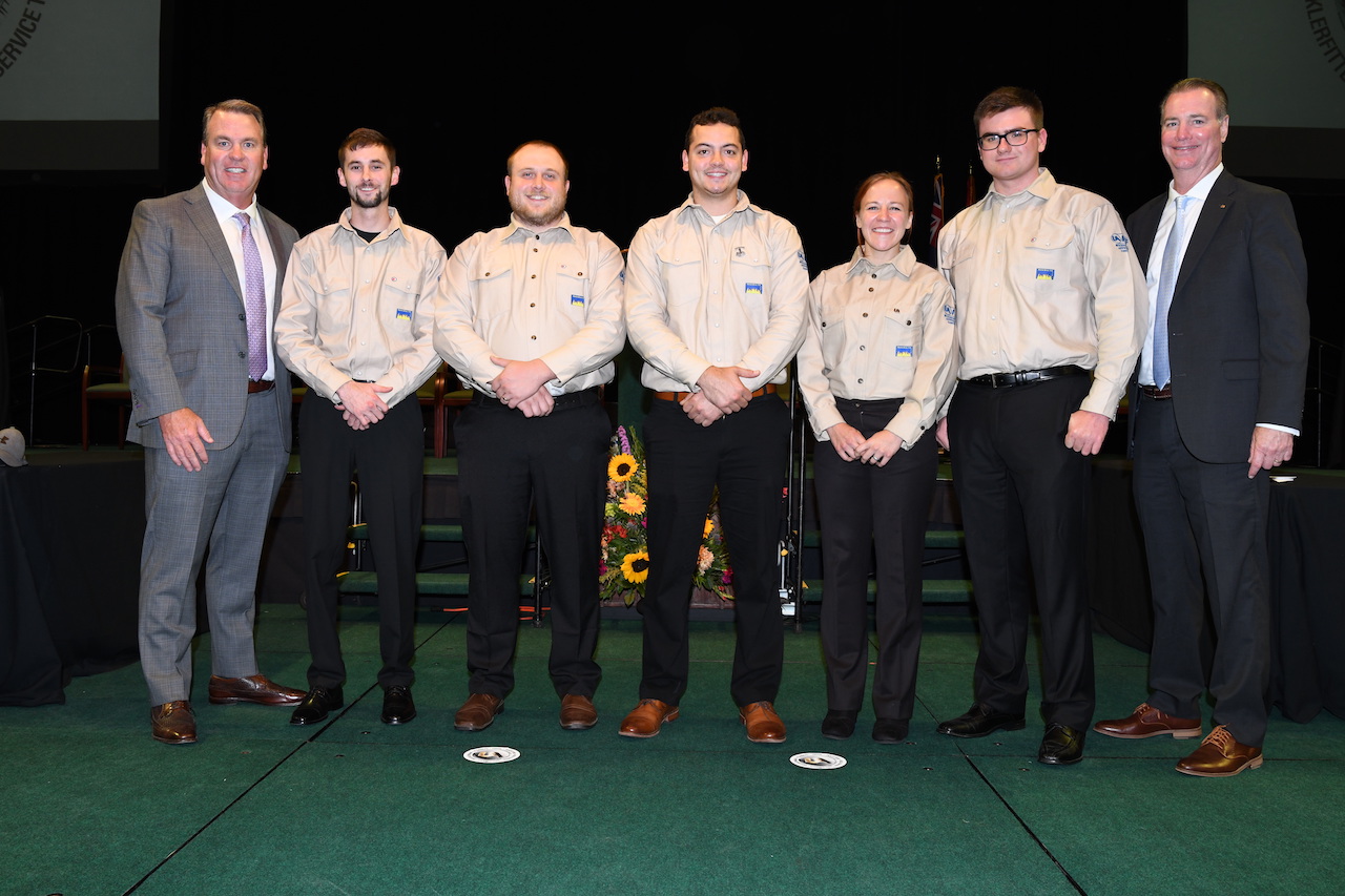 Winners of the International Apprenticeship Contest pose for a victory photo. From left: Alex Svetz, Ronald Amen, Camron Little, Carin Dahlin, Cole Rodgers. Courtesy of Dean Battaglia.