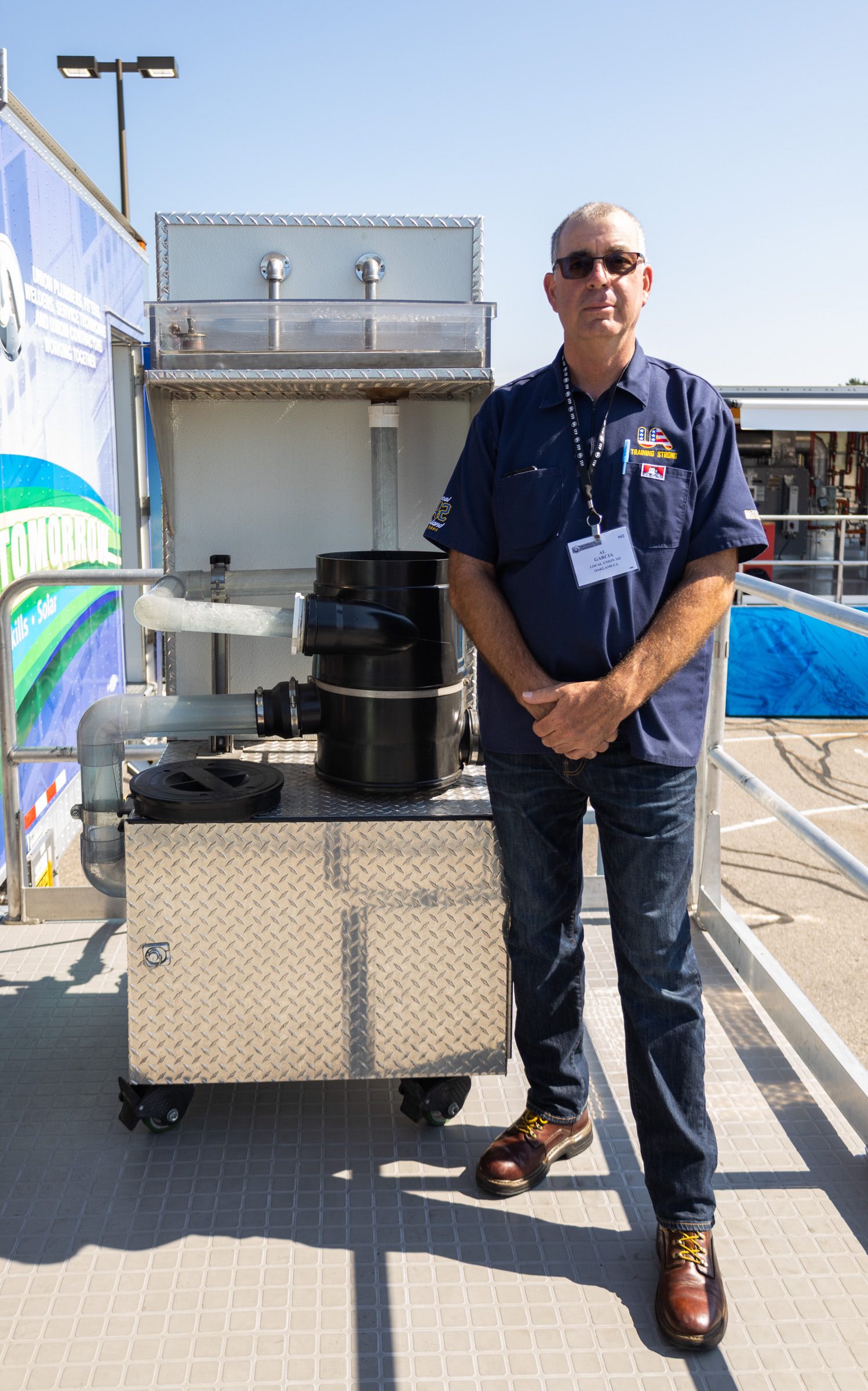 Al Garcia of Oakland, CA stands next to a rain flow harvesting system. Paula Farmer | Washtenaw Community College