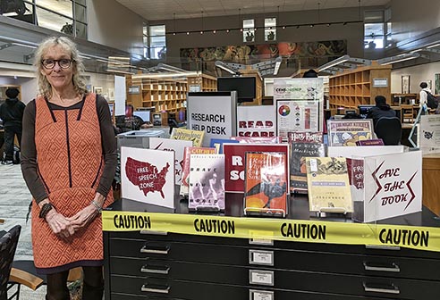 WCC librarian Maureen Perault stands next to a display of banned and challenged books for Banned Books Week. Jacob Kuiper | Washtenaw Voice.