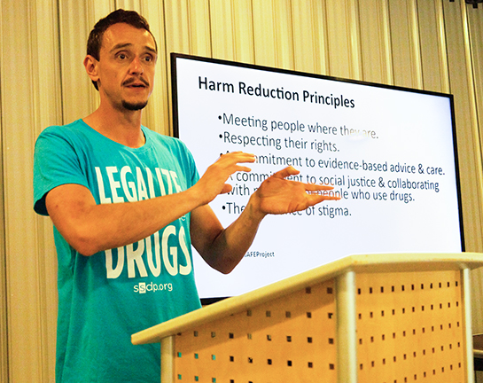 Matt Strang, peer educator for the CRP, talks about harm reduction strategies. Ruby Go | Washtenaw Voice
