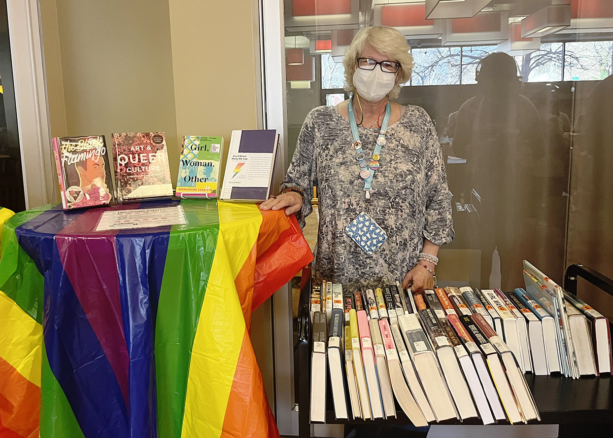 Access Service Technician Cate Karain displays LGBTQ+ books from the Bailey Library. Photo Courtesy Christina Do.