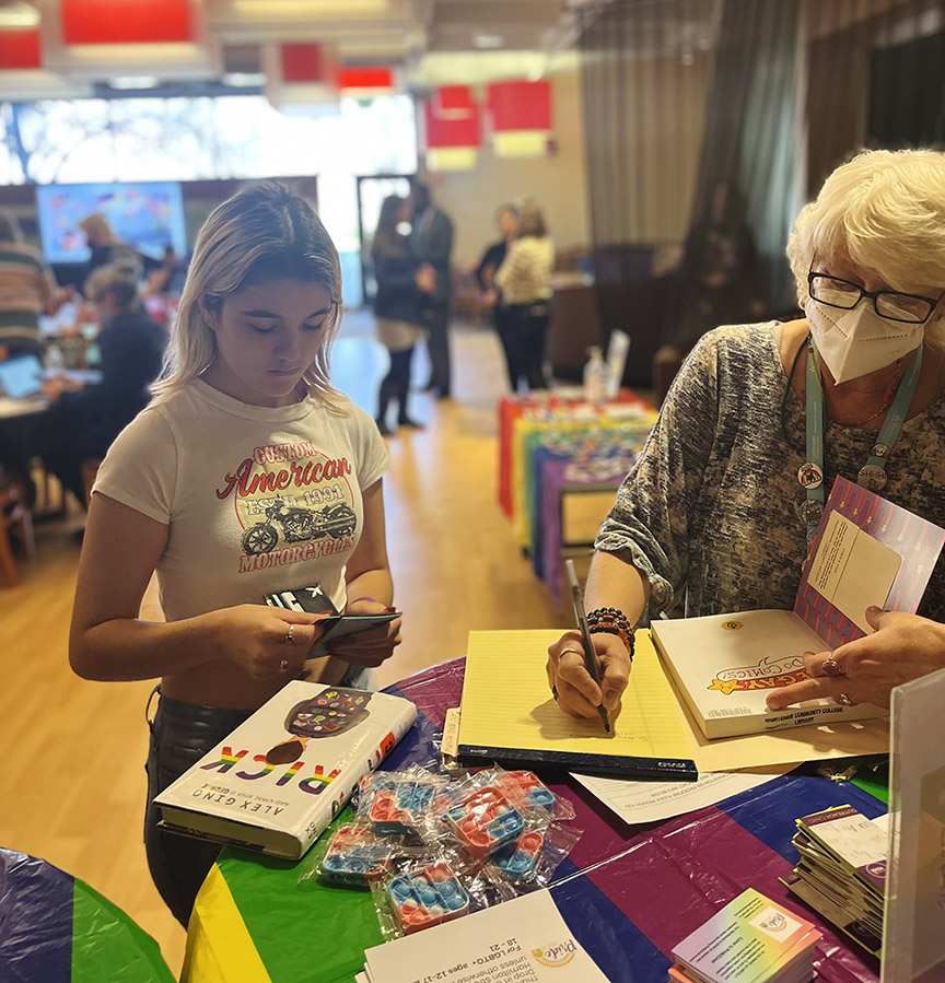 Outspace+ President, Kenzy Couch, checks out one of the LGBTQ+ books. Bailey Library’s Access Service Technician, Cate Karain, records the information. Photo courtesy Mia Lanier-Durkins