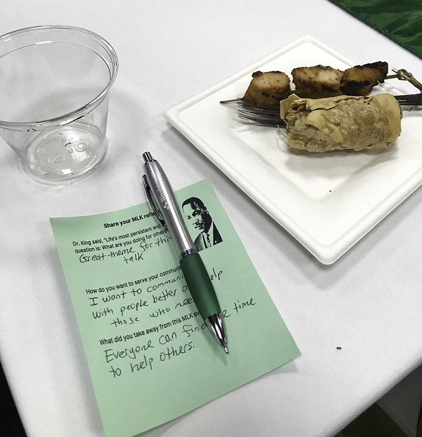 Attendees filled out reflection worksheets for the MLK Day event while dining on food and refreshments. Willow Symonds