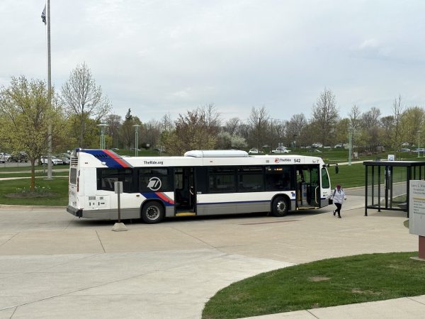 TheRide’s bus 542 stops in the Student Center’s drive-in loop, where a student exits toward the Larry L. Whitworth Occupational Building. Willow Symonds | Washtenaw Voice