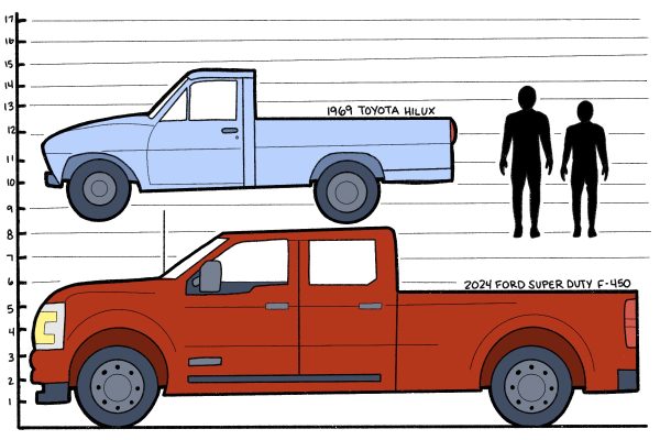 Size comparisons between retro pickups, modern trucks and the average height of men and women in the U.S. Charlie Trumbull | Washtenaw Voice