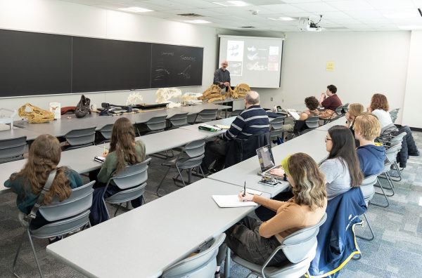 Zoology professor David Wooten taught an introductory lesson on dinosaurs to an audience of attendees at the event, saying he is a huge supporter of Free College Week “because it brings education accessibility to the community.”