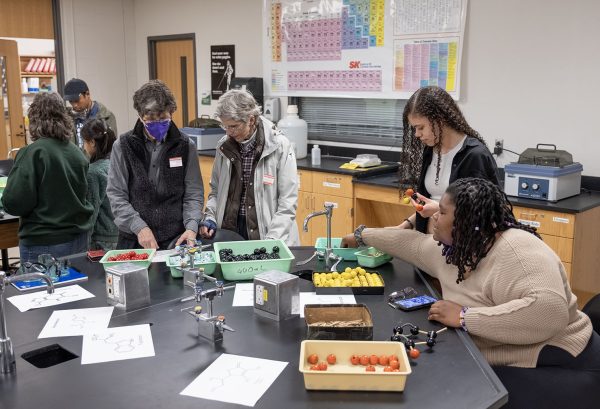 Tracy Schwab, a professor at WCC (safety goggles to the right), helping students understand the molecule structure that they are building. Courtney Prielipp | Washtenaw Voice.