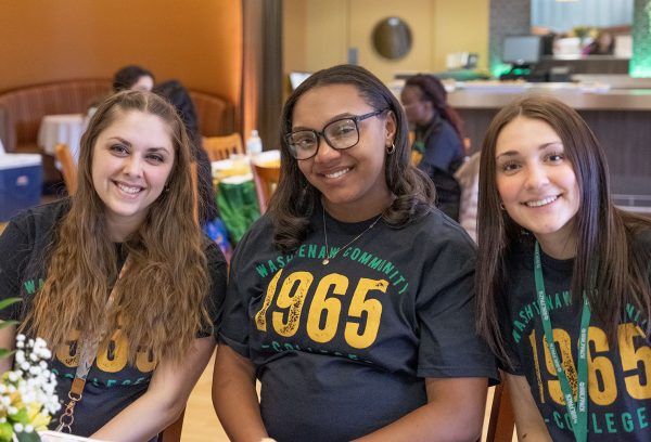 Veronica Capraru (left), Michelle Hanke (middle), and Zoe Rezler are employees of WCC helping people sign in for free college day. Courtney Prielipp | Washtenaw Voice