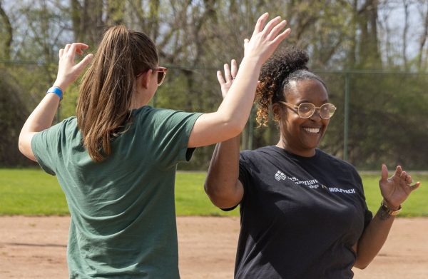 Taryn Willis high-fives her teammate after successfully making it to home plate. Paula Farmer | Washtenaw Voice