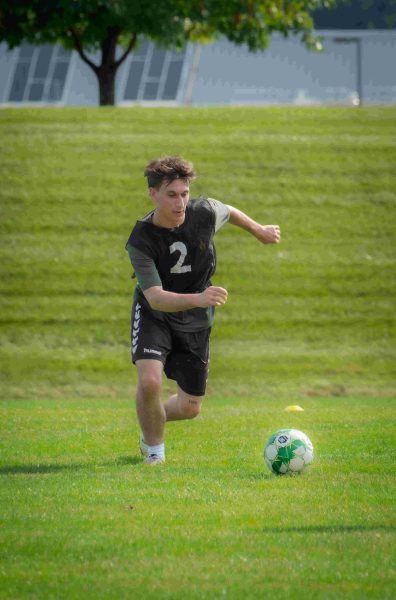 - Aleksandr Katsambouris, No. 2, is sprinting towards the unoccupied ball.