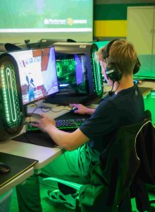 Lucas Devine, a WTMC student, playing Fortnite during the esports free play hours. Courtney Prielipp | Washtenaw Voice